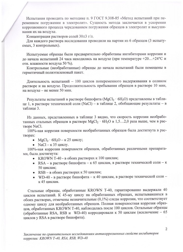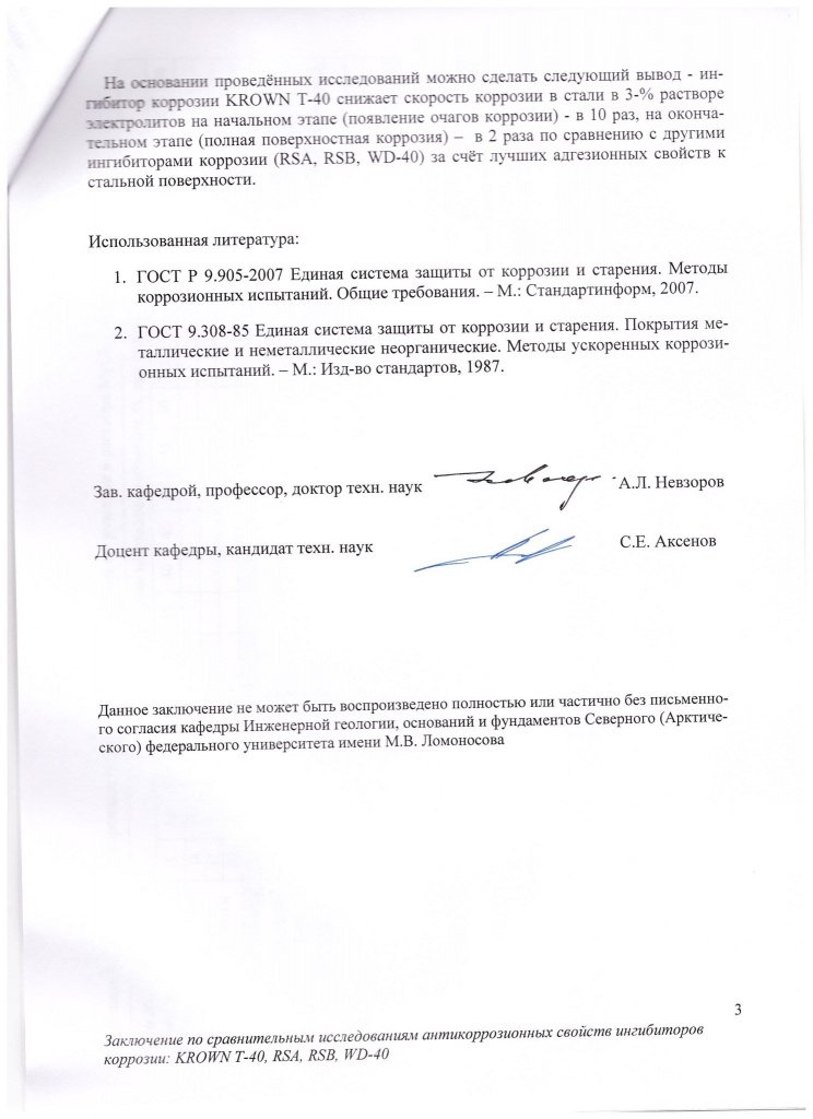 ЗАКЛЮЧЕНИЕ по сравнительным исследованием антикоррозийных свойств "Ингибитор коррозии KROWN® T-40