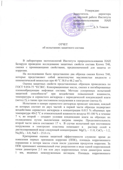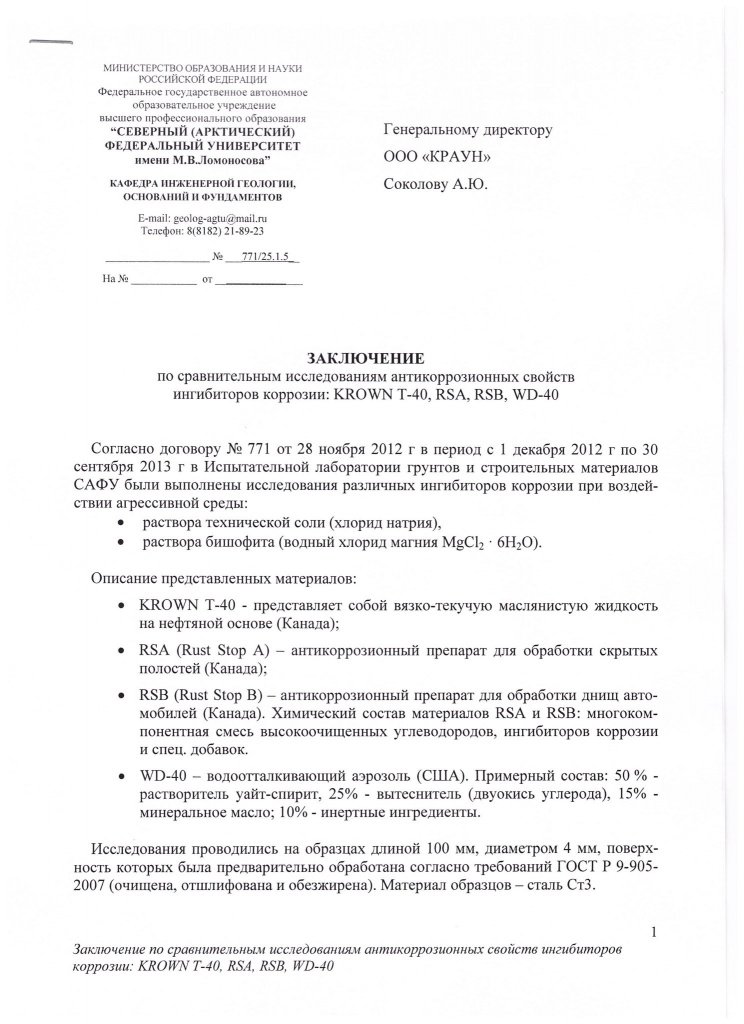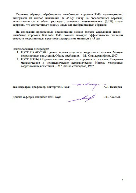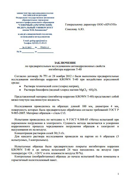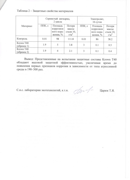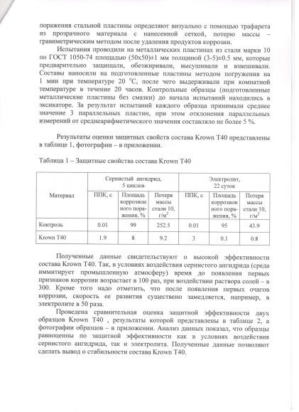 Заключение экспертов по эффективности состава KROWN - T40