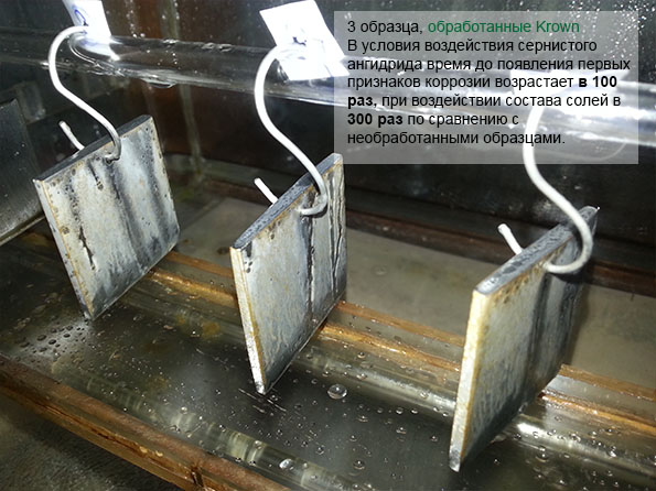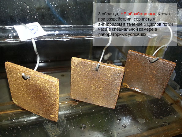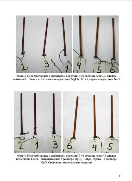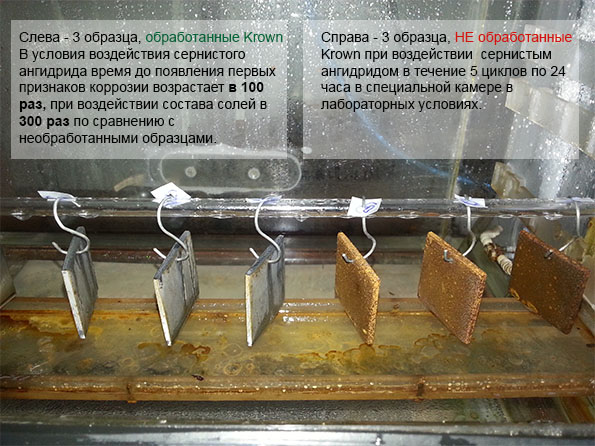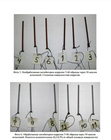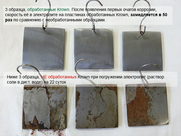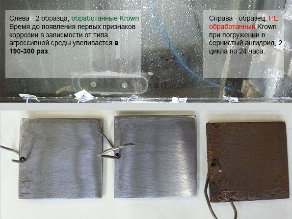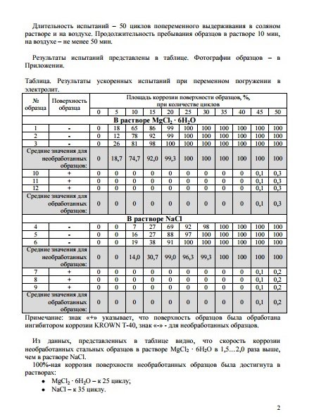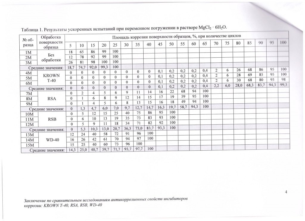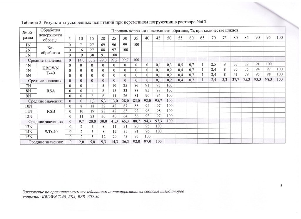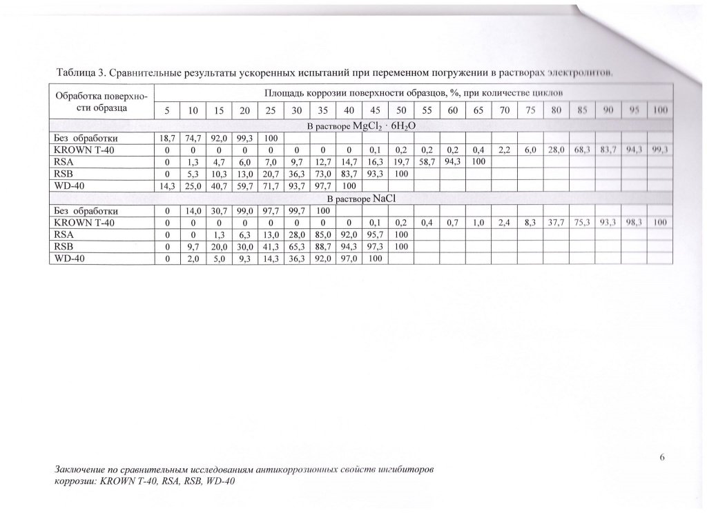"Ингибитор коррозии KROWN® T-40 снижает скорость коррозии в стали в 3-% растворе электролитов на начальном этапе (появление очагов коррозии) - в 10 раз, не окончательном этапе (полная поверхностная коррозия) - в 2 раза по сравнению с другими ингибиторами коррозии (Rust Stop A, Rust Stop B, WD-40) за счет лучших адгезионных свойств к стальной поверхности."
